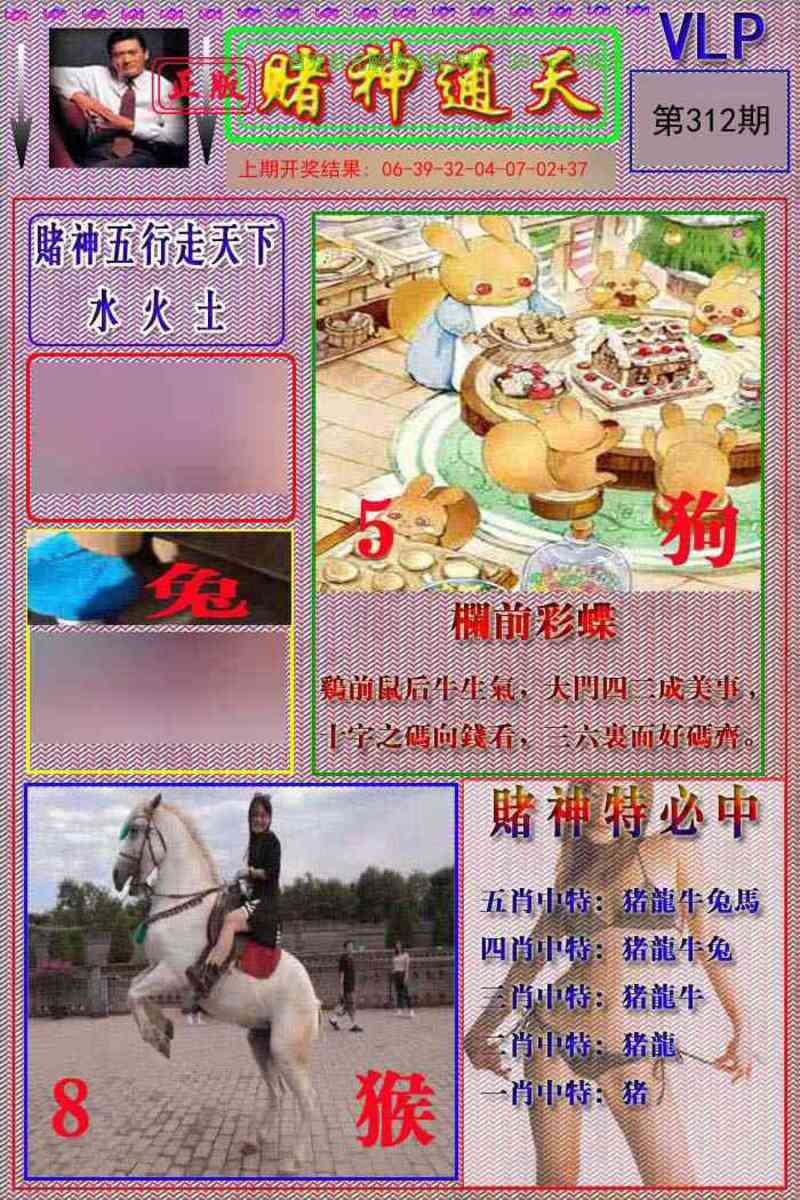| 312期:八肖 | 鸡蛇狗羊猴龙兔猪 | 开龙14准 |