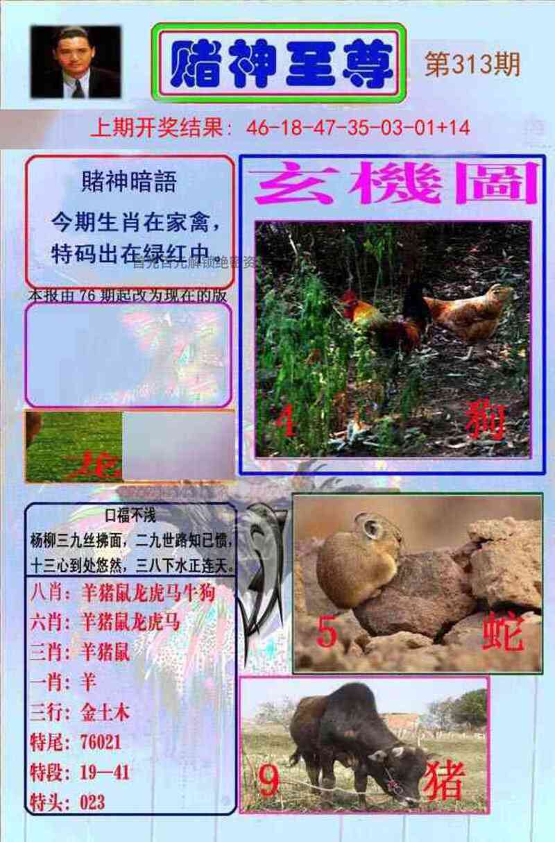 | 314期:九肖 | 狗猴鸡马兔猪羊虎牛 | 开羊23准 |